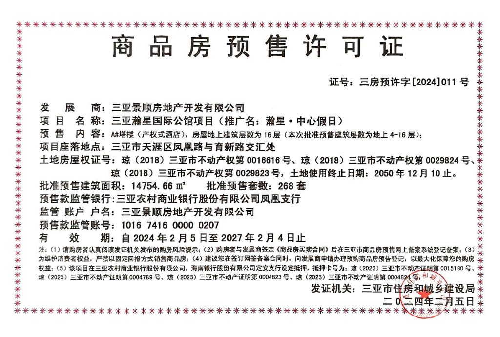 预售许可证公示(2024年11号):瀚星·中心假日A#塔楼产权式酒店