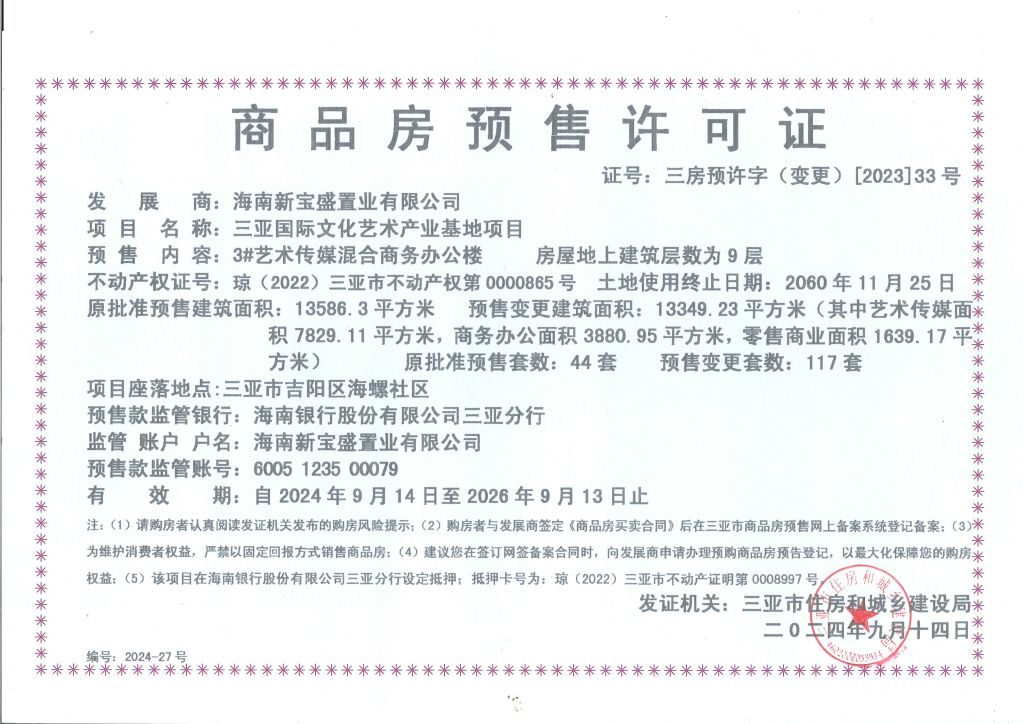 预售许可证公示(变更202333):国际文化艺术产业基地3#商办楼