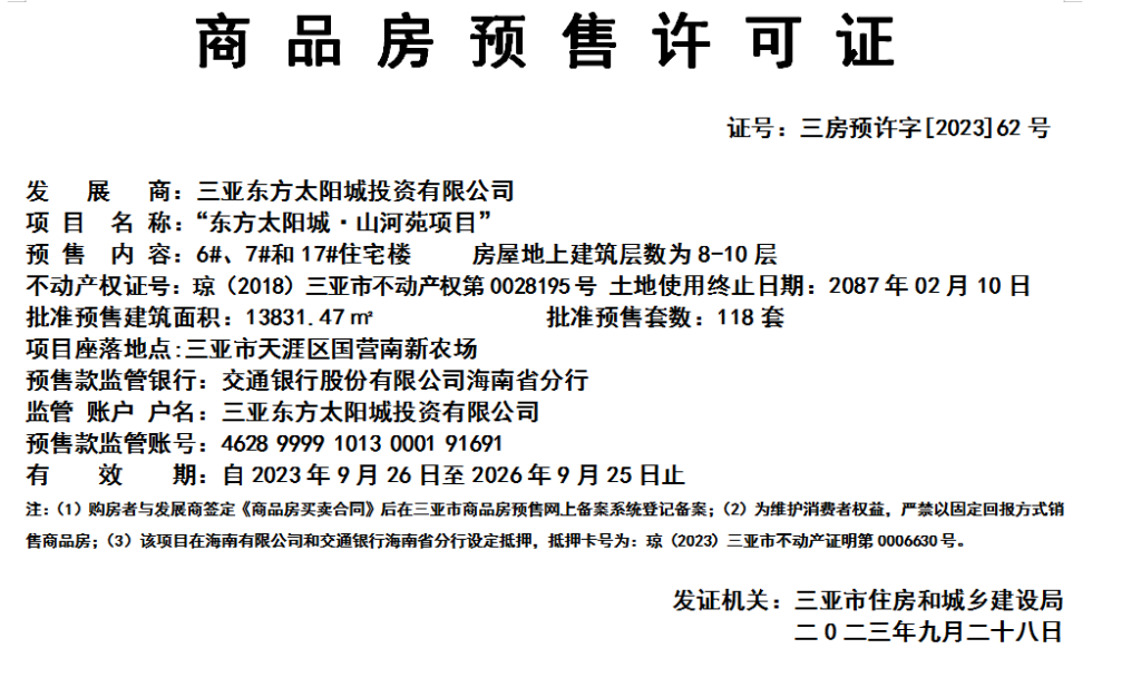 预售许可证公示(2023年62号):“东方太阳城·山河苑项目”6#、7#、和17#住宅楼预售预售