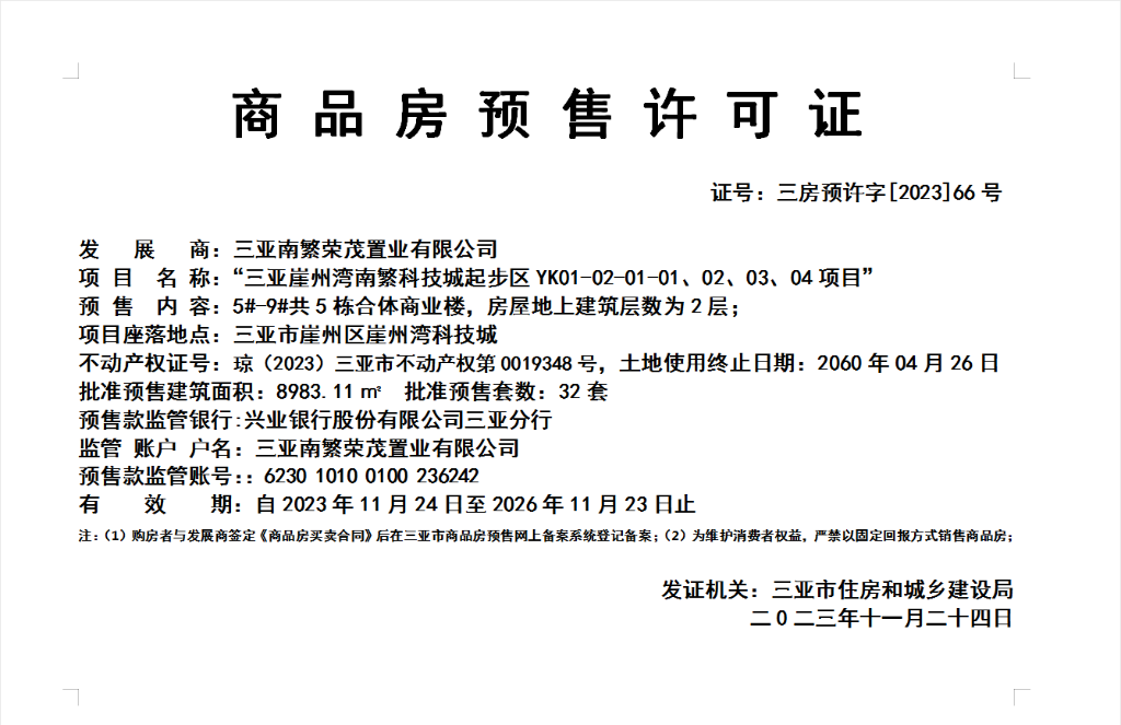 预售许可证公示(2023年66号):三亚崖州湾南繁科技城起步区5#-9#合体商业楼