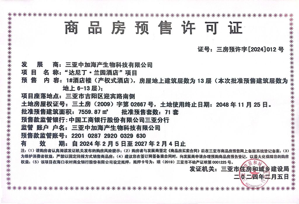 预售许可证公示(2024年12号):达尼丁·兰园酒店1#酒店楼产权式酒店