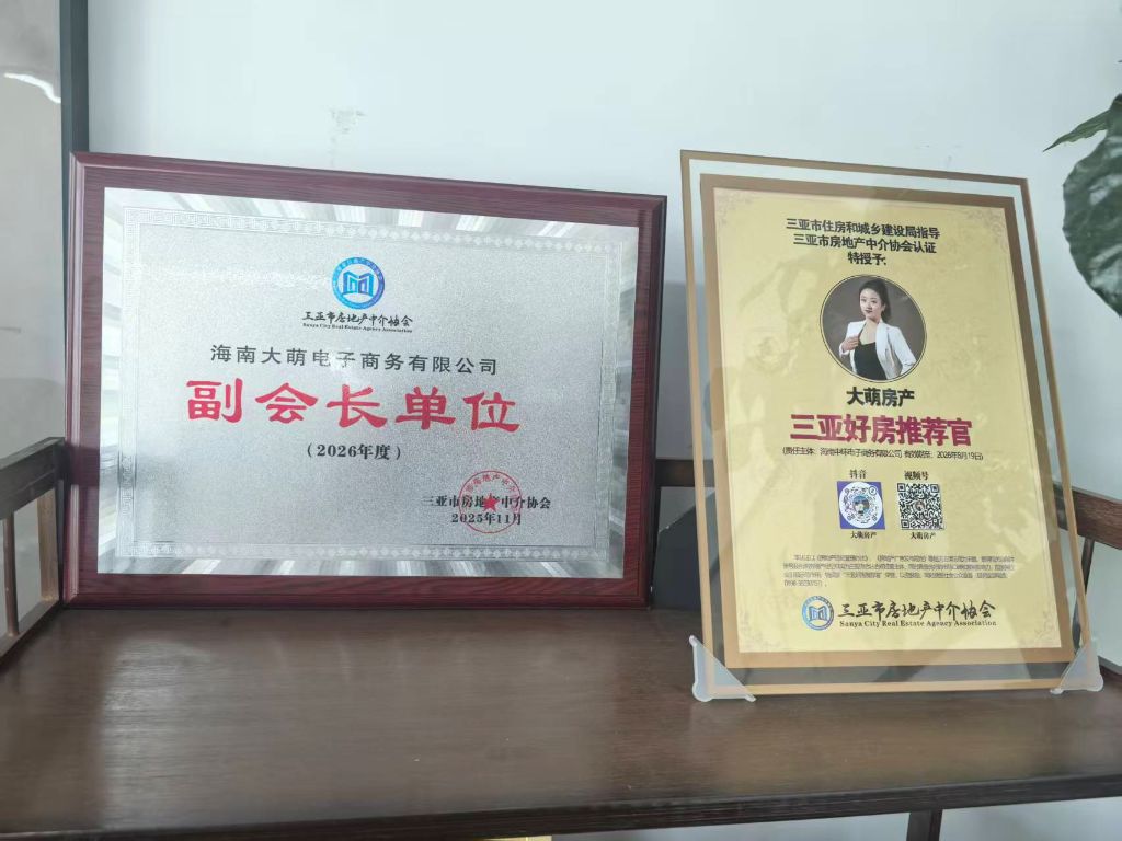 日前,经三亚市房中协理事会批准,海南大萌电子商务有限公司加入三亚市房地产中介协会,担任副会长单位及理事成员单位。