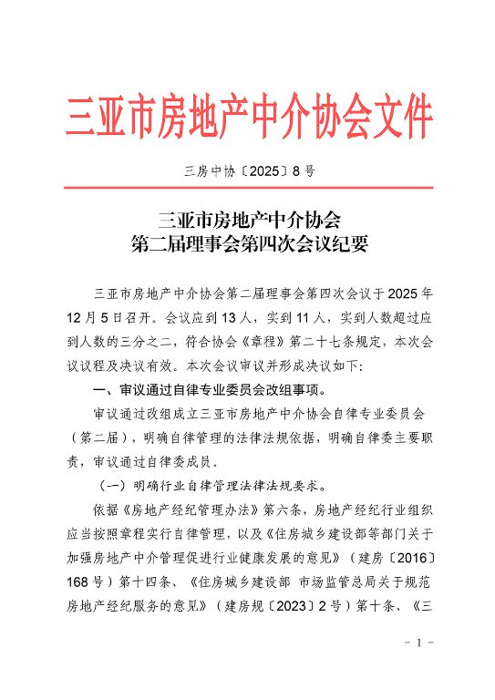 摘 要:三亚市房地产中介协会第二届理事会第四次会议于2025年12月5日召开。